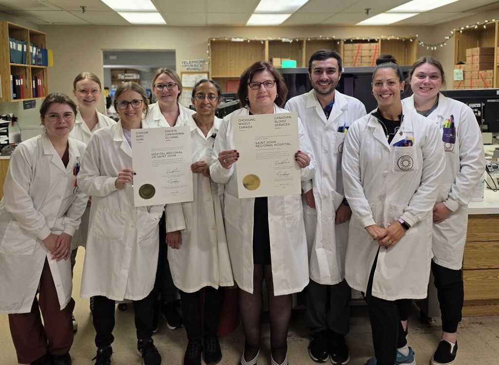 Deux hôpitaux du Réseau de santé Horizon reçoivent une désignation nationale pour leurs efforts en matière de réduction des transfusions inutiles de globules rouges novembre 21, 2025 (SAINT JOHN/MONCTON) – Deux établissements du Réseau de santé Horizon (Horizon), soit l’Hôpital régional de Saint John (HRSJ) et L’Hôpital de Moncton (LHM), ont obtenu une désignation nationale pour leurs efforts visant à conserver la réserve de sang du Canada. L’HRSJ et LHM ont récemment obtenu la désignation « Transfuser avec soin en milieu hospitalier ». Quelque 180 autres établissements au pays sont titulaires de cette désignation qui témoigne de leurs efforts de réduction des transfusions inutiles de globules rouges. Cette campagne nationale est le fruit d’un partenariat entre Choisir avec soin Canada et la Société canadienne du sang. « Nous sommes ravis que nos efforts pour assurer une bonne utilisation du sang aient été reconnus dans le cadre de cette campagne nationale », a souligné Claire Wright, gestionnaire des laboratoires de médecine transfusionnelle et de cellules souches à l’HRSJ. « Le sang est une ressource extrêmement importante pouvant sauver des vies et protéger la santé, et c’est une priorité pour nous de veiller à la conservation de cette ressource. » Pour recevoir la désignation « Transfuser avec soin en milieu hospitalier », les hôpitaux doivent atteindre ou surpasser des critères de référence nationaux et les maintenir. Les hôpitaux qui ne satisfont pas aux critères de référence peuvent s’inscrire à une initiative d’amélioration de la qualité pour ensuite présenter une demande de désignation. Selon Choisir avec soin Canada, une campagne menée par des cliniciens visant la réduction des examens et des traitements inutiles, les transfusions inappropriées sont courantes dans les hôpitaux, malgré un déclin général au cours des dernières années. Cette initiative tombe à point nommé, puisque la Société canadienne du sang prévoit une augmentation de près de 10 % de la demande pour des produits sanguins au cours des cinq prochaines années. « Nous sommes fiers des équipes de l’Hôpital régional de Saint John et de L’Hôpital de Moncton qui ont travaillé à l’obtention de cette désignation », a affirmé le vice-président aux services professionnels d’Horizon, Jeff Carter. « Les initiatives comme celles-ci viennent appuyer le pilier stratégique d’Horizon visant l’excellence dans les soins hospitaliers dans la province. » Quatre autres hôpitaux du Nouveau-Brunswick sont aussi titulaires de la désignation « Transfuser avec soin en milieu hospitalier ». – 30 – Pour de plus amples renseignements, veuillez écrire à : Maggie Estey Relations avec les médias 1-877-499-1899 Media@HorizonNB.ca