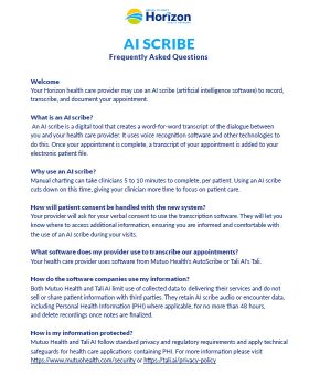AI Scribe Your Horizon health care provider may use an AI scribe (artificial intelligence software) to record, transcribe, and document your appointment. Frequently Asked Questions What is an AI scribe?An AI scribe is a digital tool that creates a word-for-word transcript of the dialogue between you and your health care provider. It uses voice recognition software and other technologies to do this. Once your appointment is complete, a transcript of your appointment is added to your electronic patient file. Why use an AI scribe?Manual charting can take clinicians 5 to 10 minutes to complete, per patient. Using an AI scribe cuts down on this time, giving your clinician more time to focus on patient care. How will patient consent be handled with the new system?Your provider will ask for your verbal consent to use the transcription software. They will let you know where to access additional information, ensuring you are informed and comfortable with the use of an AI scribe during your visits. What software does my provider use to transcribe our appointments?Your health care provider uses software from Mutuo Health’s AutoScribe or Tali AI’s Tali. How do the software companies use my information?Both Mutuo Health and Tali AI limit use of collected data to delivering their services and do not sell or share patient information with third parties. They retain AI scribe audio or encounter data, including Personal Health Information (PHI) where applicable, for no more than 48 hours,and delete recordings once notes are finalized. How is my information protected?Mutuo Health and Tali AI follow standard privacy and regulatory requirements and apply technical safeguards for health care applications containing PHI. For more information please visit Mutuo Health’s AutoScribe or Tali AI’s Tali. Does the software meet security requirements for PHI?Mutuo Health and Tali AI adhere to Canadian data privacy standards such as the Personal Information Protection and Electronic Documents Act (PIPEDA) and SOC 2 standards for secure data management practices. DOWNLOAD PDF